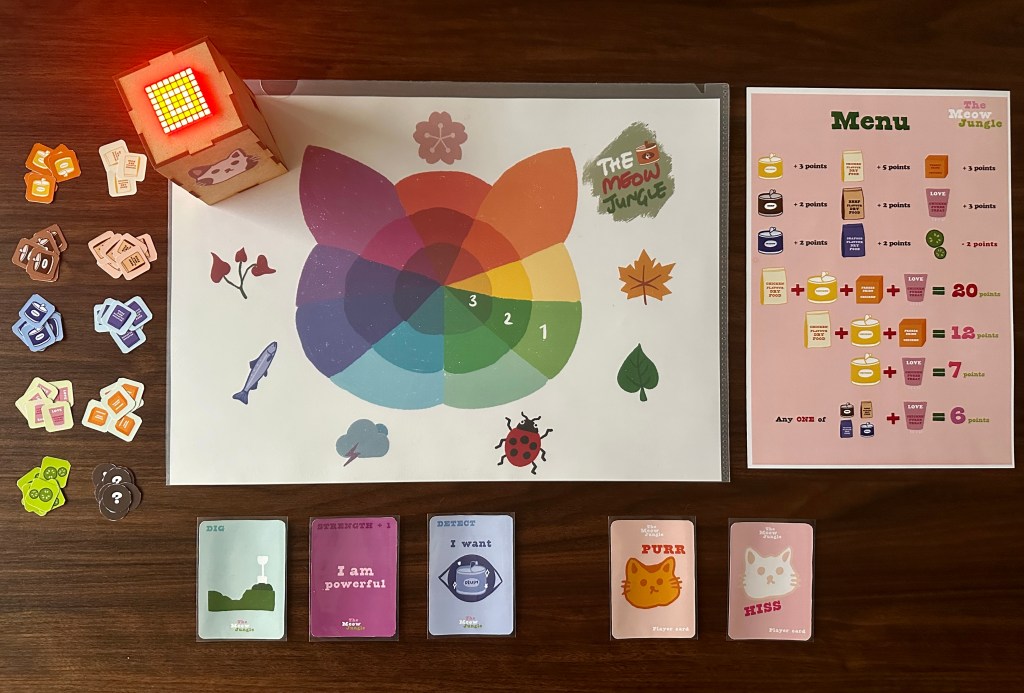 In The Meow Jungle, each player acts as a food hunter for King Peppercorn, ruler of the jungle. The Meow Jungle uses RFID to create an exciting tangible experience, with an LED matrix that communicates information about the board.